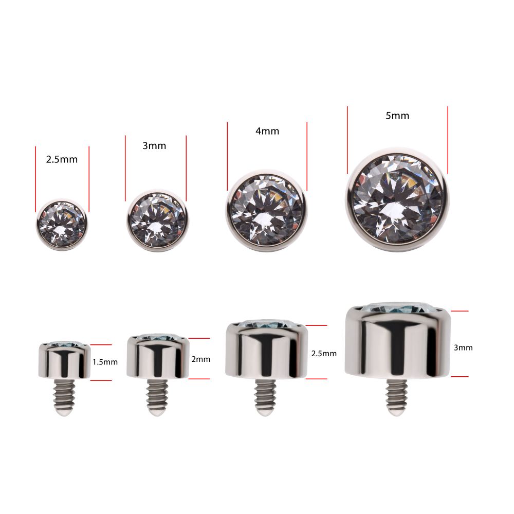 14g Titanium Internally Threaded with Bezel Set AAA CZ Top fits M1.2/14G Internally Threaded Jewelry. Available in 2.5mm, 3mm, 4mm & 5mm sizes. No glue used to set gems. Manufactured from High Polish Implant Grade Titanium (Ti-6AL-4V-ELI ASTM F136).