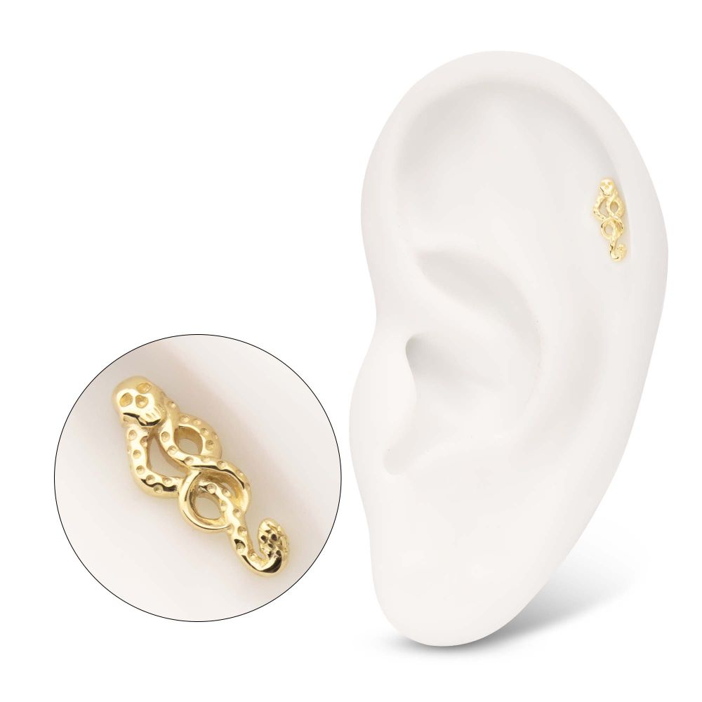 14Kt Gold Harry Potter Dark Mark Symbol Threadless Top. Made of solid 14kt nickel-free Gold with durable 316LVM ASTM F-138 Implant Grade Steel Pin designed to be practical and easy to use. Fits all sizes of pins and bases in our threadless body jewelry line. Pin Size: 0.45mm x 4.7mm.