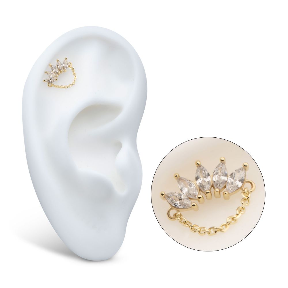 14Kt Gold Threadless 5 Cluster Marquise Prong Set Gem Fan Top with Chain Dangle. Made of solid 14kt nickel-free Gold with durable 316LVM ASTM F-138 Implant Grade Steel Pin designed to be practical and easy to use. Fits all sizes of pins and bases in our threadless body jewelry line. Pin Size: 0.45mm x 4.7mm.