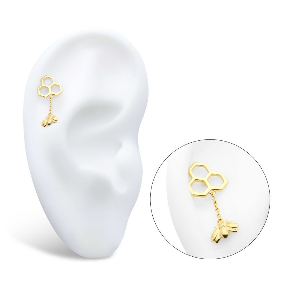 14Kt Gold Threadless Honeycomb Top with Dangle Chain & Bee Top. Made of solid 14kt nickel-free Gold with durable 316LVM ASTM F-138 Implant Grade Steel Pin designed to be practical and easy to use. Fits all sizes of pins and bases in our threadless body jewelry line. Pin Size: 0.45mm x 4.7mm.