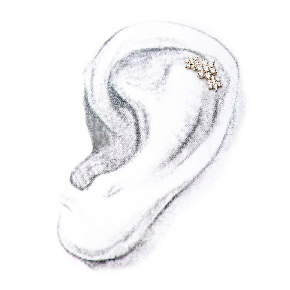 Three flowers form an arc on this multi clear cubic zirconia 14k gold threadless top that hugs the ear, but can also be worn in any piercing. Compatible with any threadless Invictus bar or base in any gauge. To secure inside bar or base, add a slight bend to the pin by simply inserting the pin halfway and pushing the top to one side.