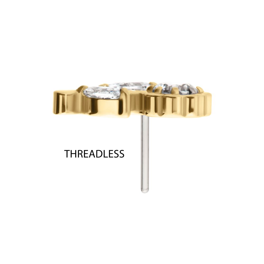 14Kt Gold Threadless Rose Flower & Stem Top with Prong Set Rond & Marquise Gem. Made of solid 14kt nickel-free Gold with durable 316LVM ASTM F-138 Implant Grade Steel Pin designed to be practical and easy to use. Fits all sizes of pins and bases in our threadless body jewelry line. Pin Size: 0.45mm x 4.7mm
