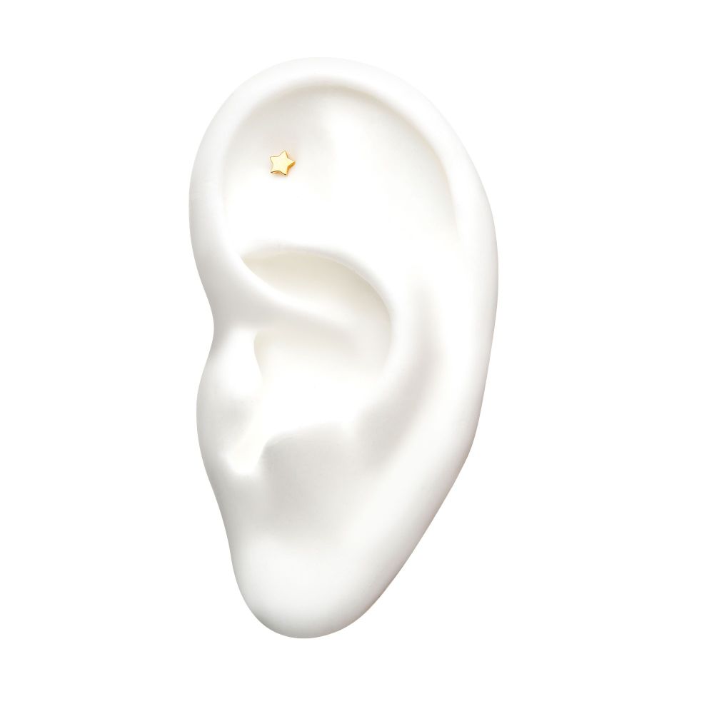 Threadless Star Top is made of solid 14kt nickel-free Gold with durable 316LVM ASTM F-138 Implant Grade Steel Pin designed to be practical and easy to use. Fits all sizes of pins and bases in our threadless body jewelry line. Dimension: 4.5mm (L) x 4.5mm (W) x 1.2mm (THK); Pin Size: 0.45mm x 4.7mm.