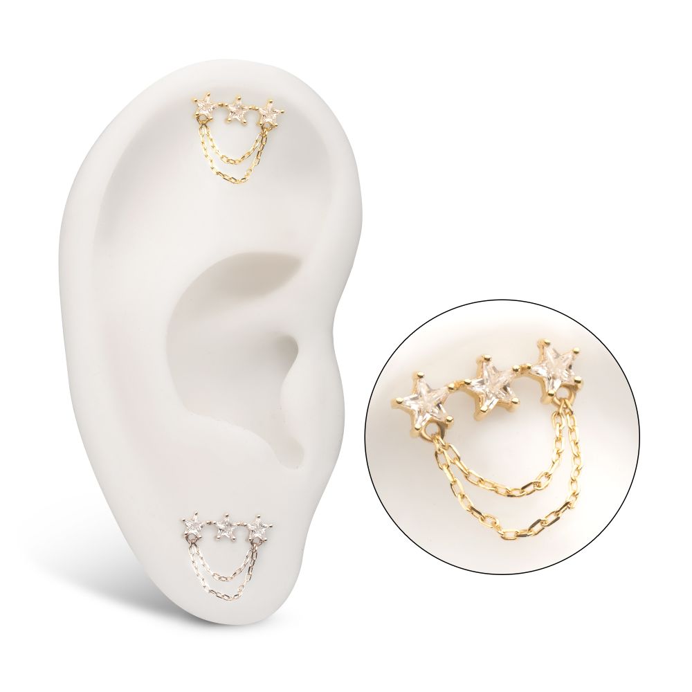 ? Triple star cluster gem with double draping chains adds movement & flair to helix and lobe piercings.
