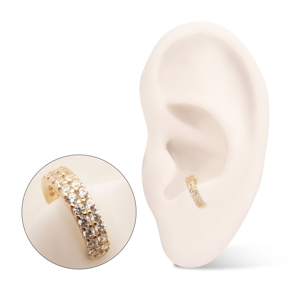 14Kt Yellow Gold Double Row Pave Gem Side Facing Hinged Segment Clicker. The Hinged Segment Clicker offers an easy-to-use design with a minimal seam for an aesthetic that's similar to a segment ring without the stress of dealing with a segment that can get lost. The Hinged Segment Clicker is characterized by the hinged prong that snaps into place with a satisfying click. Perfect for Helix, Septum and Cartilage. Made of solid 14kt nickel-free Gold.