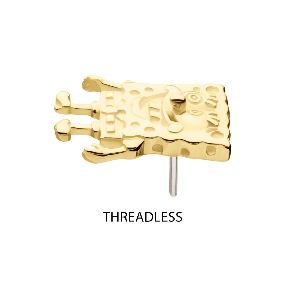 14Kt Yellow Gold Nickelodeon SpongeBob SquarePants Threadless Top is made of solid 14kt nickel-free Gold with durable 316LVM ASTM F-138 Implant Grade Steel Pin designed to be practical and easy to use. Fits all sizes of pins and bases in our threadless body jewelry line. Pin Gauge: 25g