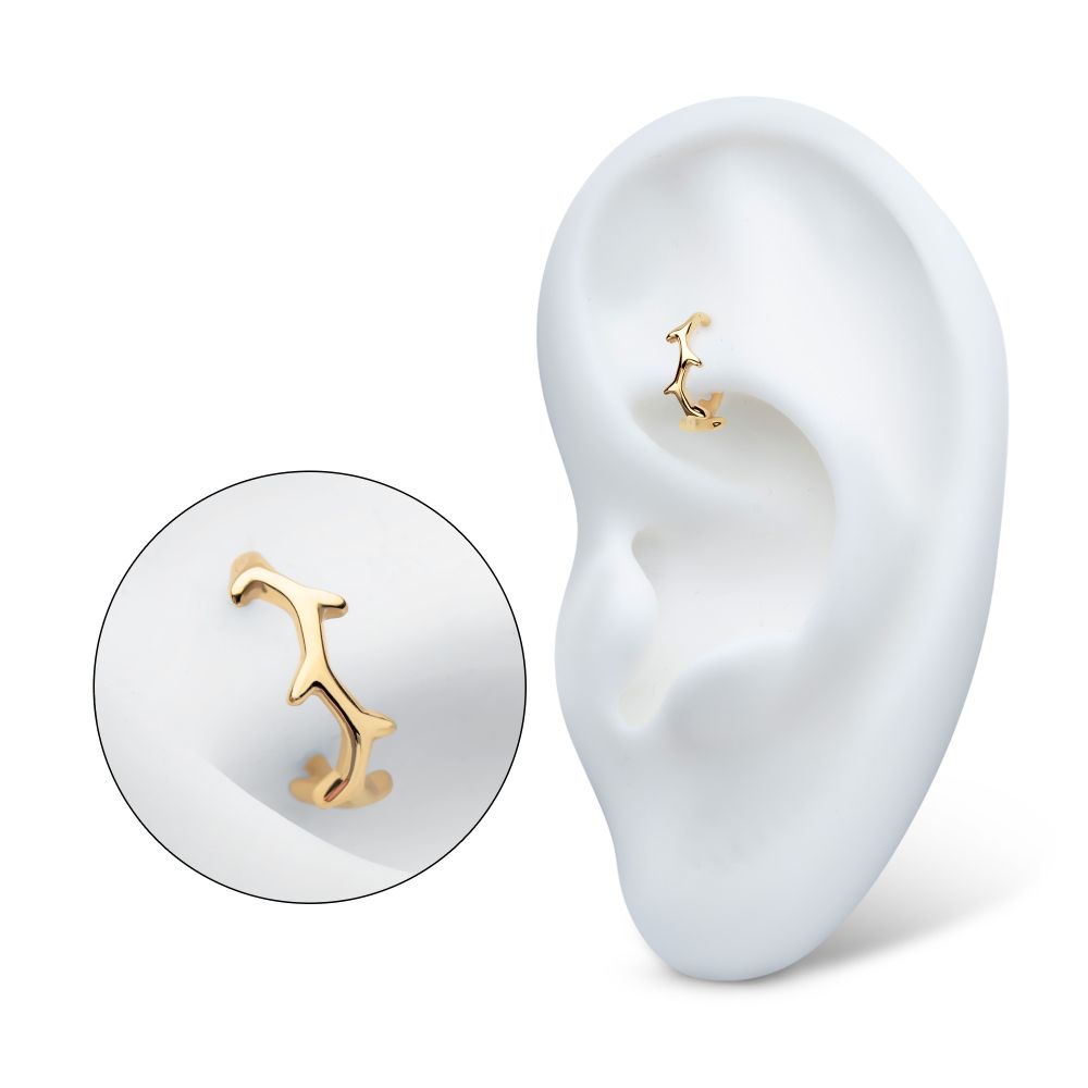 14Kt Yellow Gold Thorn H₂O₂ Side Facing Hinged Segment Clicker. The Hinged Segment Clicker offers an easy-to-use design with a minimal seam for an aesthetic that's similar to a segment ring without the stress of dealing with a segment that can get lost. The Hinged Segment Clicker is characterized by the hinged prong that snaps into place with a satisfying click. Perfect for Helix, Septum, and Cartilage. Made of solid 14kt nickel-free Gold.