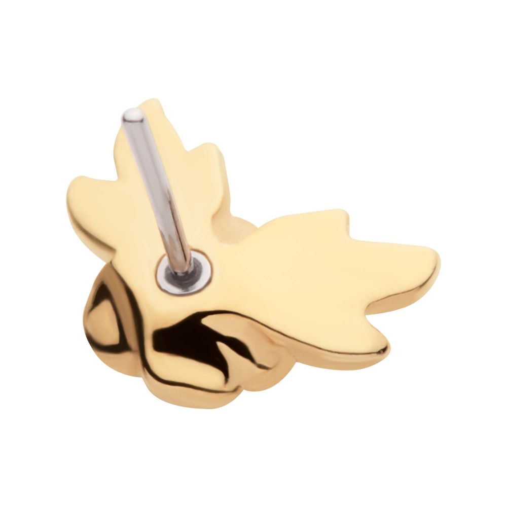 14Kt Yellow Gold Threadless Angled Rose with Leaves Top is made of solid 14kt nickel-free Gold with durable 316LVM ASTM F-138 Implant Grade Steel Pin designed to be practical and easy to use. Fits all sizes of pins and bases in our threadless body jewelry line. Pin Size: 0.45mm x 4.7mm.