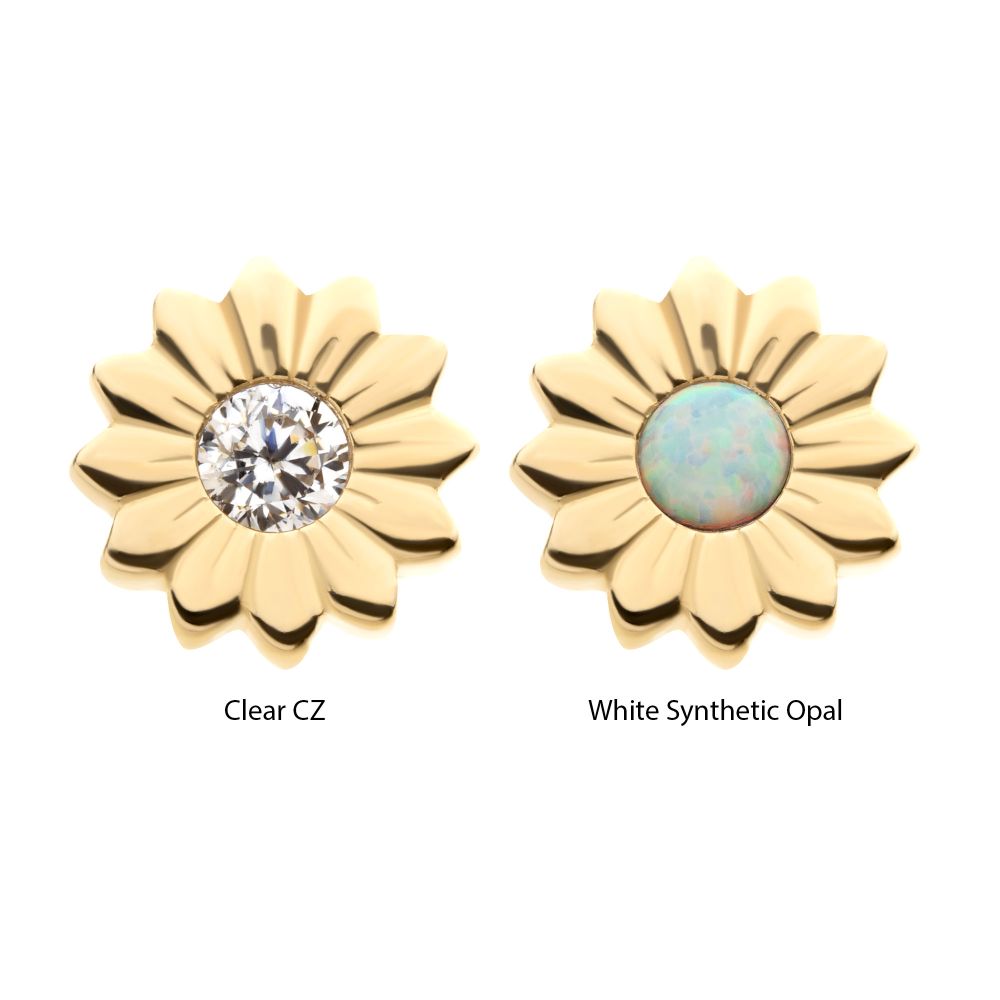 Twelve solid gold petals surround a lovely gem in our Sunflower tops, featuring your choice of Clear Cubic Zirconia, or White Synthetic Opal.
