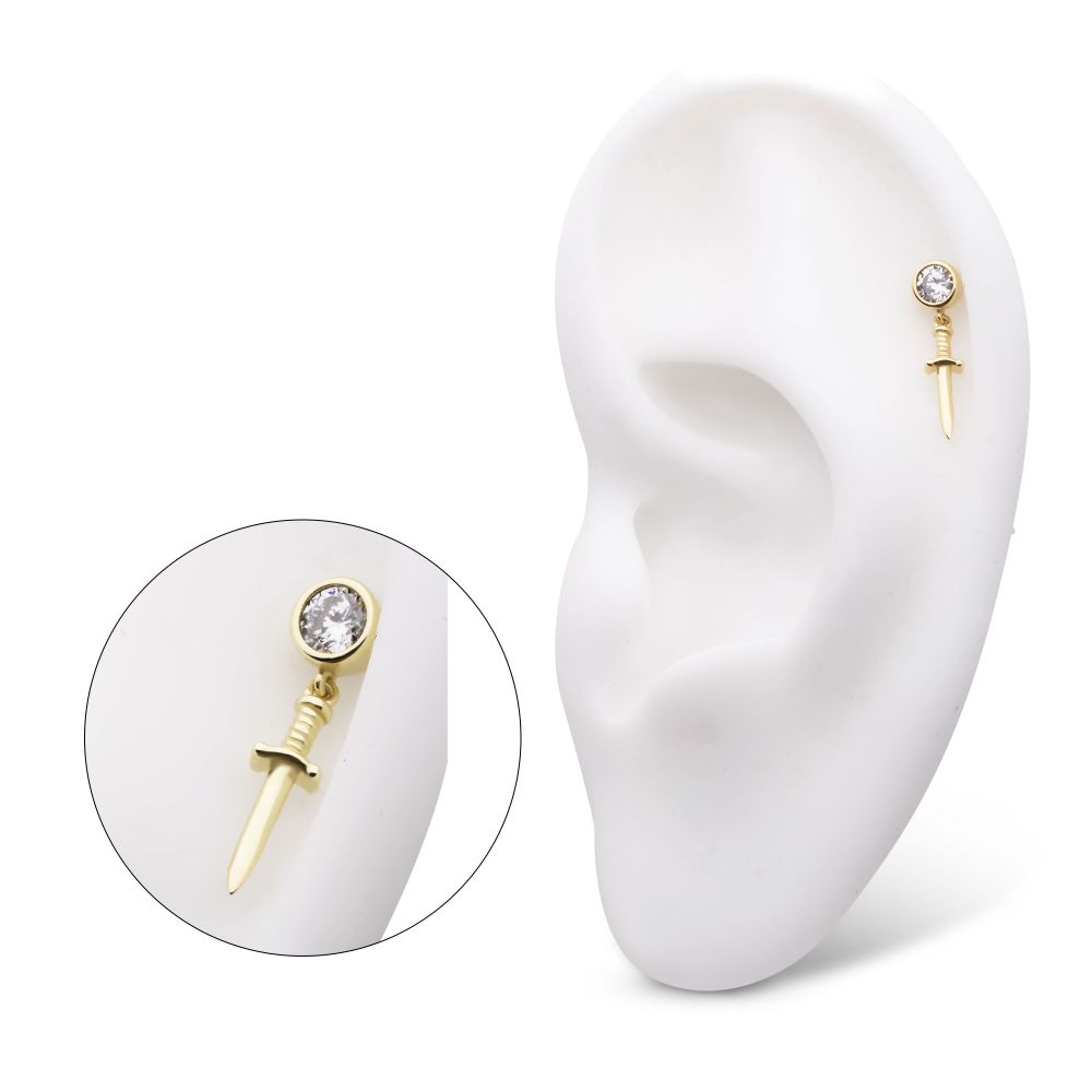 14Kt Yellow Gold Threadless Bezel Set Round CZ with Dangle Dagger Top. Made of solid 14kt nickel-free Gold with durable 316LVM ASTM F-138 Implant Grade Steel Pin designed to be practical and easy to use. Fits all sizes of pins and bases in our threadless body jewelry line. Pin Size: 0.45mm x 4.7mm.