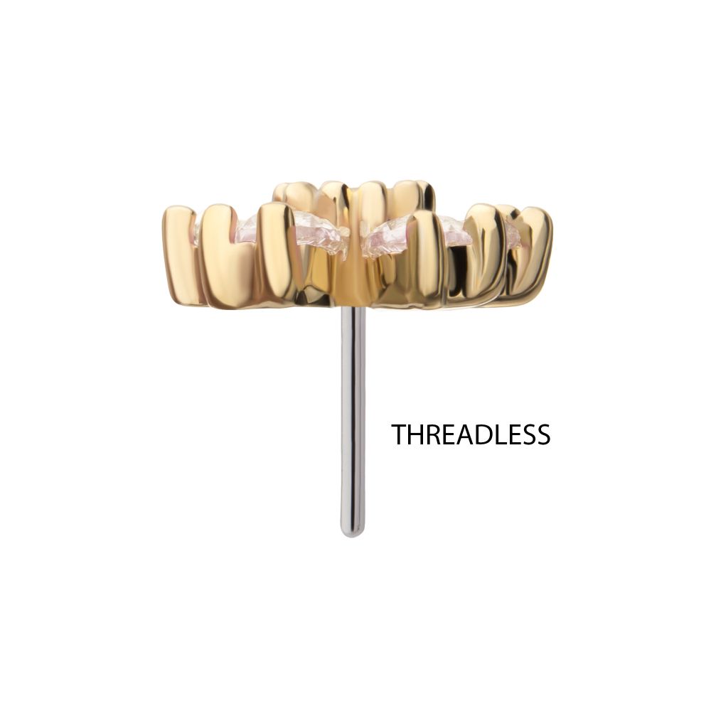 14Kt Yellow Gold Threadless Cherry Blossom Flower Top with 5-Petal Prong Set Gem. Made of solid 14kt nickel-free Gold with durable 316LVM ASTM F-138 Implant Grade Steel Pin designed to be practical and easy to use. Fits all sizes of pins and bases in our threadless body jewelry line. Pin Size: 0.45mm x 4.7mm.