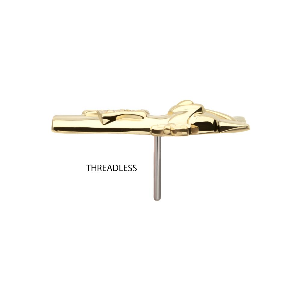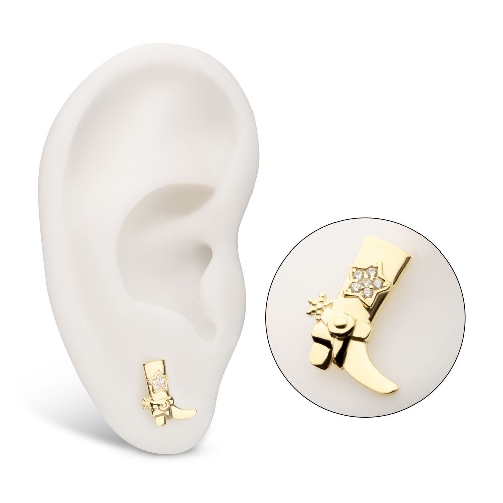 14Kt Yellow Gold Threadless Cowboy Boot Top with Inlayed Pave Gem Star. Detailed cowboy boot complete with spur and pave gem star inlay. Made of solid 14kt nickel-free Gold with durable 316LVM ASTM F-138 Implant Grade Steel Pin designed to be practical and easy to use. Fits all sizes of pins and bases in our threadless body jewelry line. Pin Size: 0.45mm x 4.7mm.