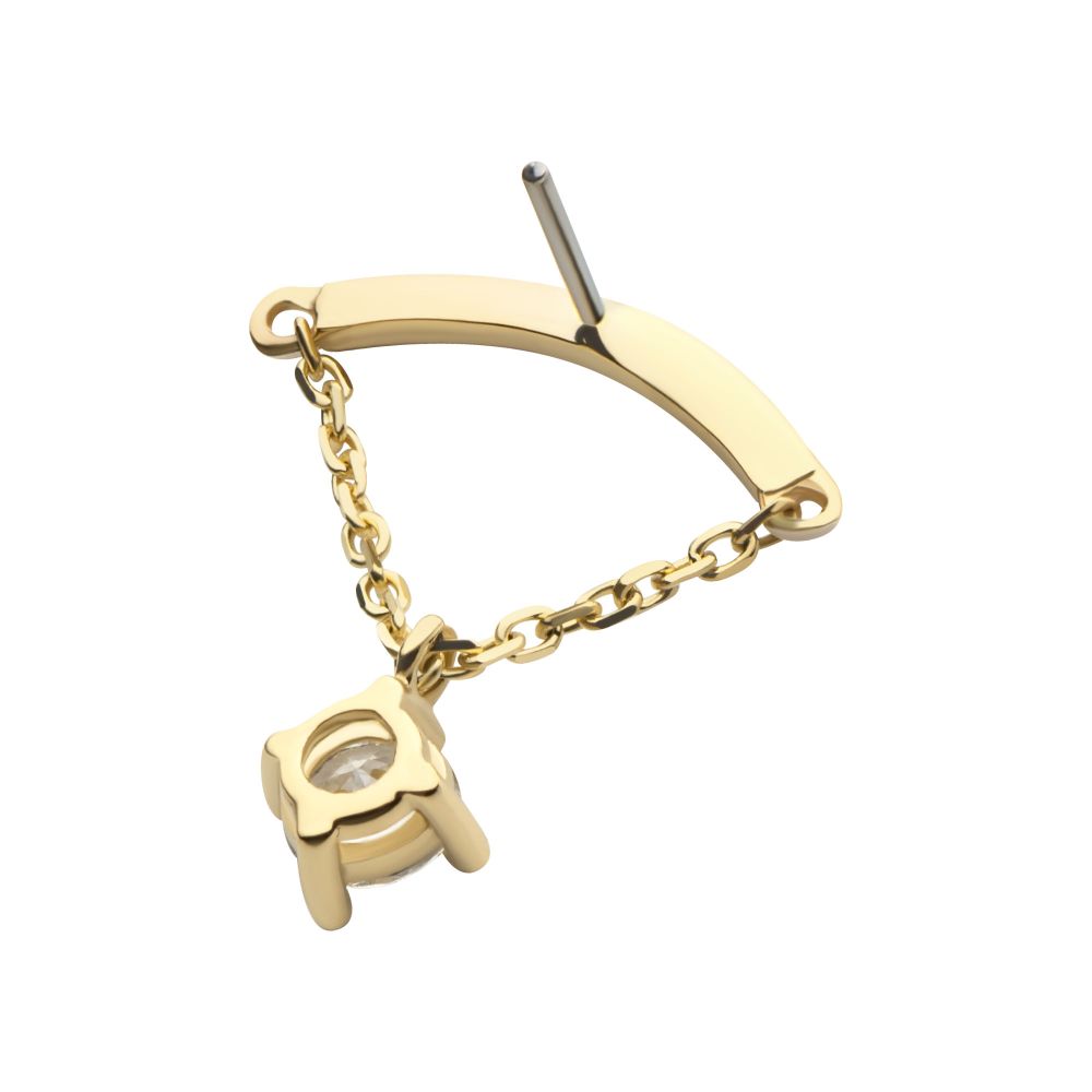 14Kt Yellow Gold Threadless Curve Bar Top with 1 Round Prong Set CZ Dangle Chain. Made of solid 14kt nickel-free Gold with durable 316LVM ASTM F-138 Implant Grade Steel Pin designed to be practical and easy to use. Fits all sizes of pins and bases in our threadless body jewelry line. Pin Size: 0.45mm x 4.7mm.