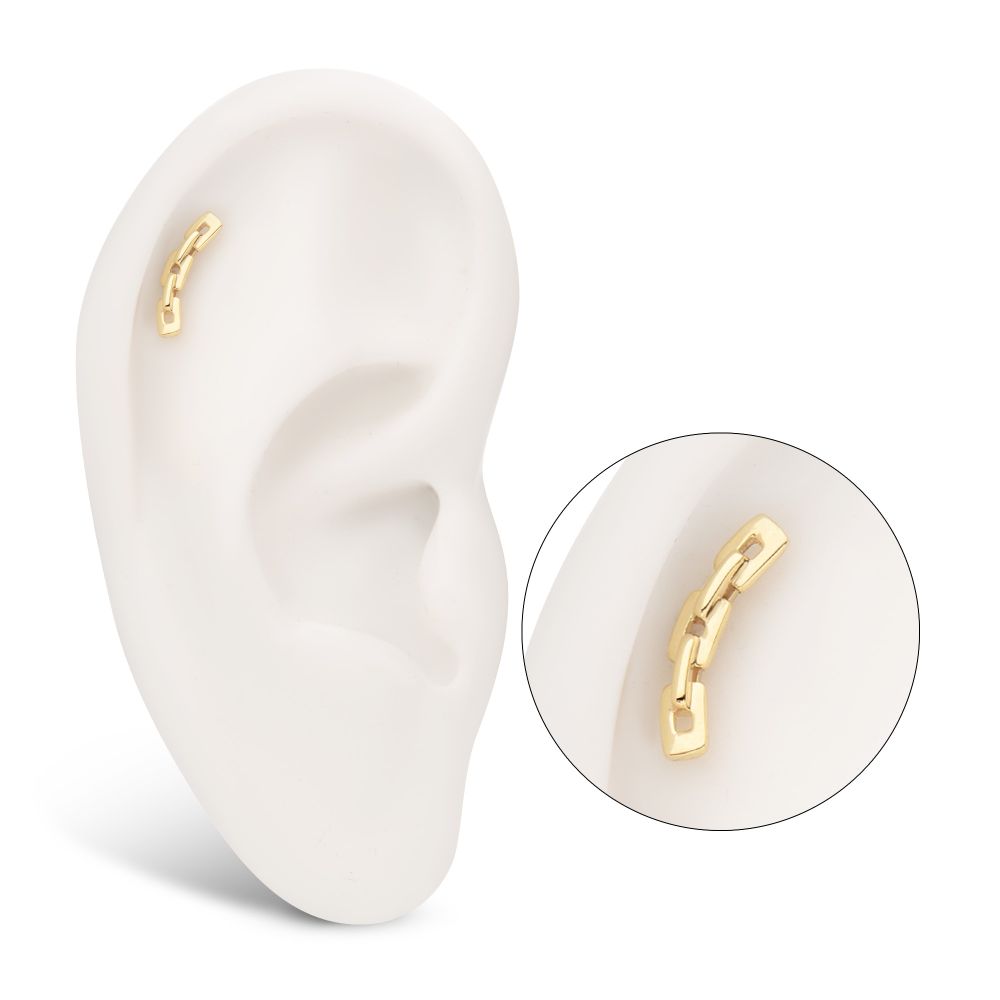 14Kt Yellow Gold Threadless Curved Chain Link Top. Made of solid 14kt nickel-free Gold with durable 316LVM ASTM F-138 Implant Grade Steel Pin designed to be practical and easy to use. Fits all sizes of pins and bases in our threadless body jewelry line. Pin Size: 0.45mm x 4.7mm.