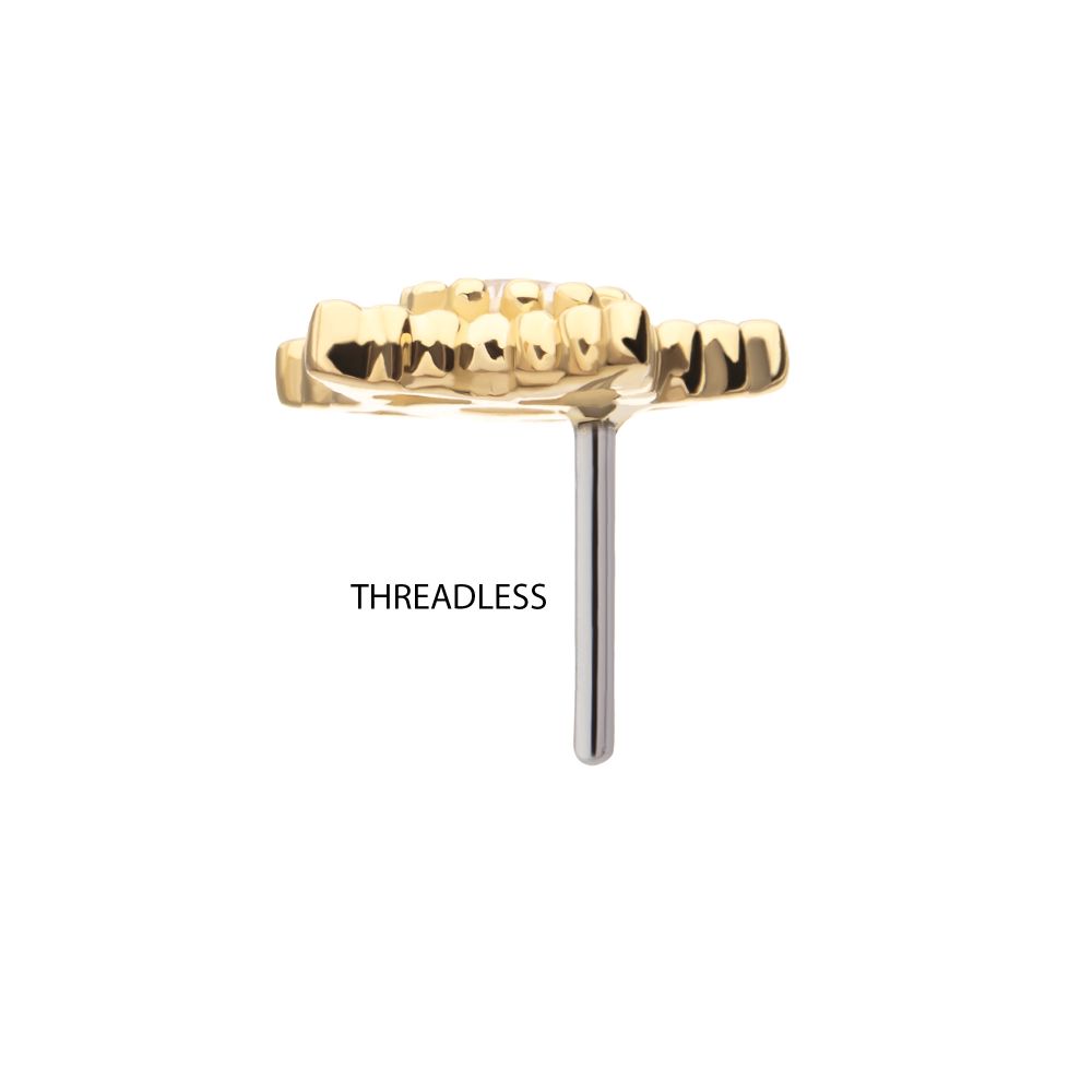 14Kt Yellow Gold Threadless Cut Out Beaded Edge Star Top with Gem. Made of solid 14kt nickel-free Gold with durable 316LVM ASTM F-138 Implant Grade Steel Pin designed to be practical and easy to use. Fits all sizes of pins and bases in our threadless body jewelry line. Pin Size: 0.45mm x 4.7mm.
