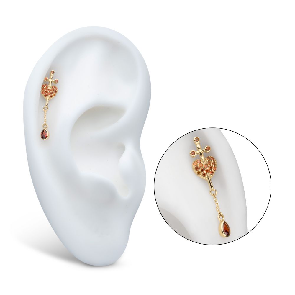 14Kt Yellow Gold Threadless Dagger Heart Top with Pave Garnet Gem & Teardrop Chain Dangle . Made of solid 14kt nickel-free Gold with durable 316LVM ASTM F-138 Implant Grade Steel Pin designed to be practical and easy to use. Fits all sizes of pins and bases in our threadless body jewelry line. Pin Size: 0.45mm x 4.7mm.