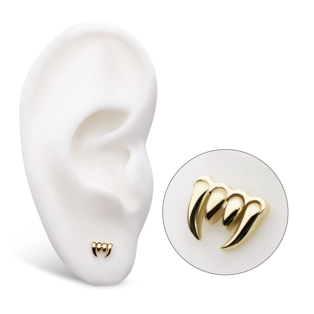 14Kt Yellow Gold Threadless Fangs Top. Made of solid 14kt nickel-free Gold with durable 316LVM ASTM F-138 Implant Grade Steel Pin designed to be practical and easy to use. Fits all sizes of pins and bases in our threadless body jewelry line. Pin Size: 0.45mm x 4.7mm.