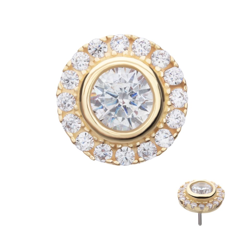 14Kt Yellow Gold Threadless Multigem Halo Top. Made of solid 14kt nickel-free Gold with durable 316LVM ASTM F-138 Implant Grade Steel Pin designed to be practical and easy to use. Fits all sizes of pins and bases in our threadless body jewelry line. Pin Size: 0.45mm x 4.7mm.