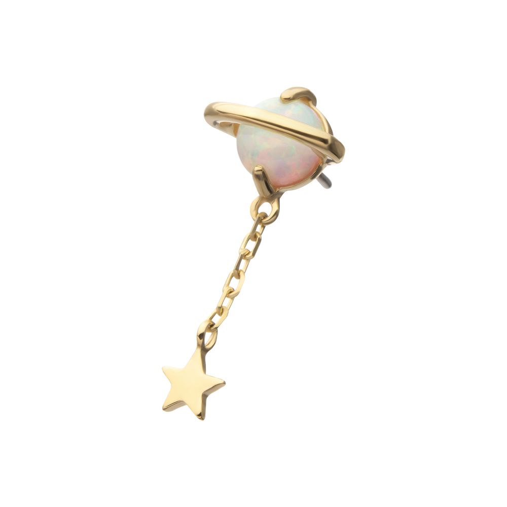 14Kt Yellow Gold Threadless Opal Planet Top with Chain Star Dangle. Made of solid 14kt nickel-free Gold with durable 316LVM ASTM F-138 Implant Grade Steel Pin designed to be practical and easy to use. Fits all sizes of pins and bases in our threadless body jewelry line. Pin Size: 0.45mm x 4.7mm.