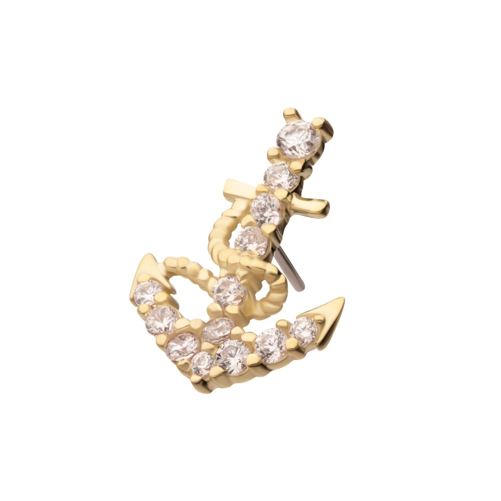 14Kt Yellow Gold Threadless Pave Gem Anchor Top. Made of solid 14kt nickel-free Gold with durable 316LVM ASTM F-138 Implant Grade Steel Pin designed to be practical and easy to use. Fits all sizes of pins and bases in our threadless body jewelry line. Pin Size: 0.45mm x 4.7mm.