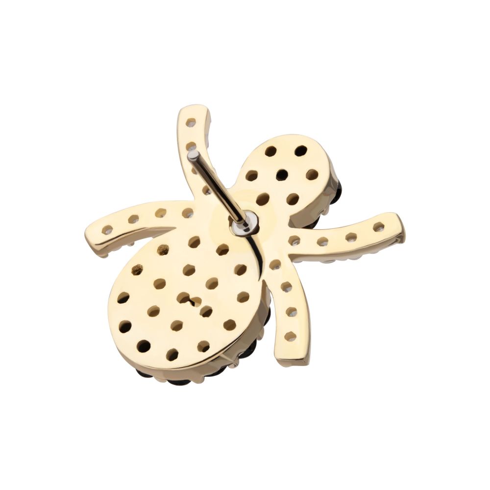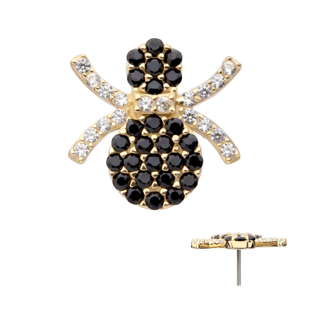14Kt Yellow Gold Threadless Pave Set Full Clear and Black Gem Spider Top. Made of solid 14kt nickel-free Gold with durable 316LVM ASTM F-138 Implant Grade Steel Pin designed to be practical and easy to use. Fits all sizes of pins and bases in our threadless body jewelry line. Pin Size: 0.45mm x 4.7mm.