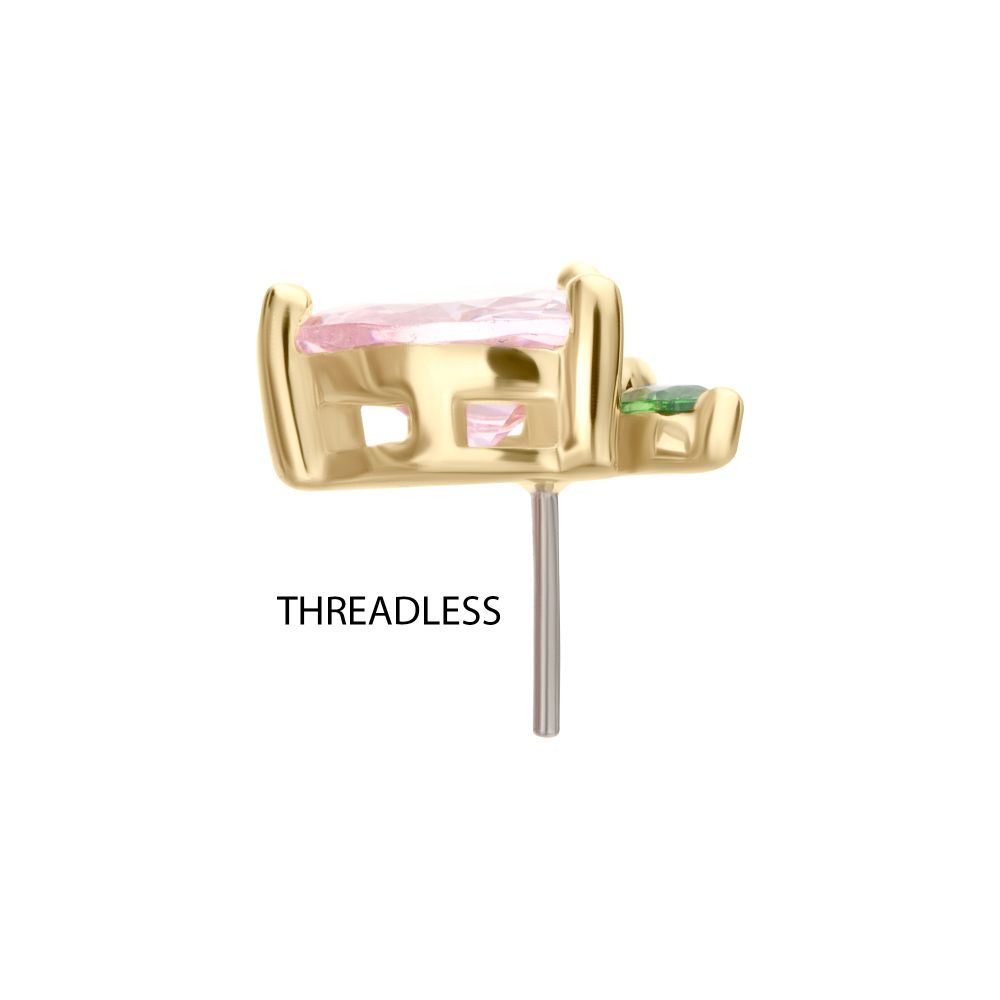 14Kt Yellow Gold Threadless Peach Heart with Leaf Top. Playful pink heart shaped peach gem with light green leaf adds a fruity charm. Made of solid 14kt nickel-free Gold with durable 316LVM ASTM F-138 Implant Grade Steel Pin designed to be practical and easy to use. Fits all sizes of pins and bases in our threadless body jewelry line. Pin Size: 0.45mm x 4.7mm.