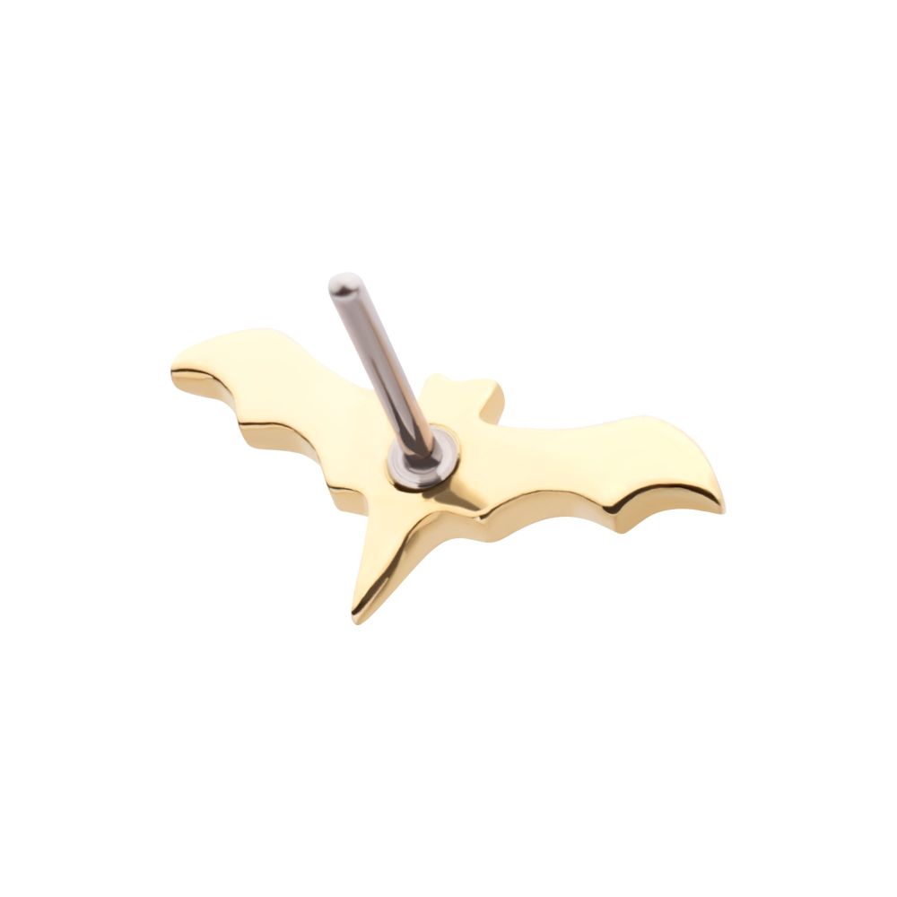 14Kt Yellow Gold Threadless Polished Finish Bat Top. Made of solid 14kt nickel-free Gold with durable 316LVM ASTM F-138 Implant Grade Steel Pin designed to be practical and easy to use. Fits all sizes of pins and bases in our threadless body jewelry line. Pin Size: 0.45mm x 4.7mm.