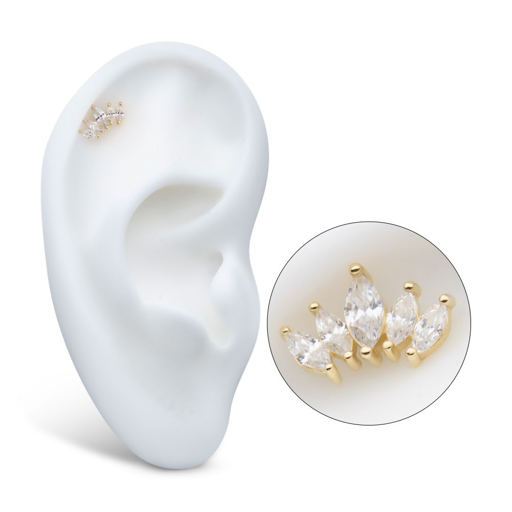 14Kt Yellow Gold Threadless Prong Set Marquise Gem Cluster Fan Shape Top. Made of solid 14kt nickel-free Gold with durable 316LVM ASTM F-138 Implant Grade Steel Pin designed to be practical and easy to use. Fits all sizes of pins and bases in our threadless body jewelry line. Pin Size: 0.45mm x 4.7mm.
