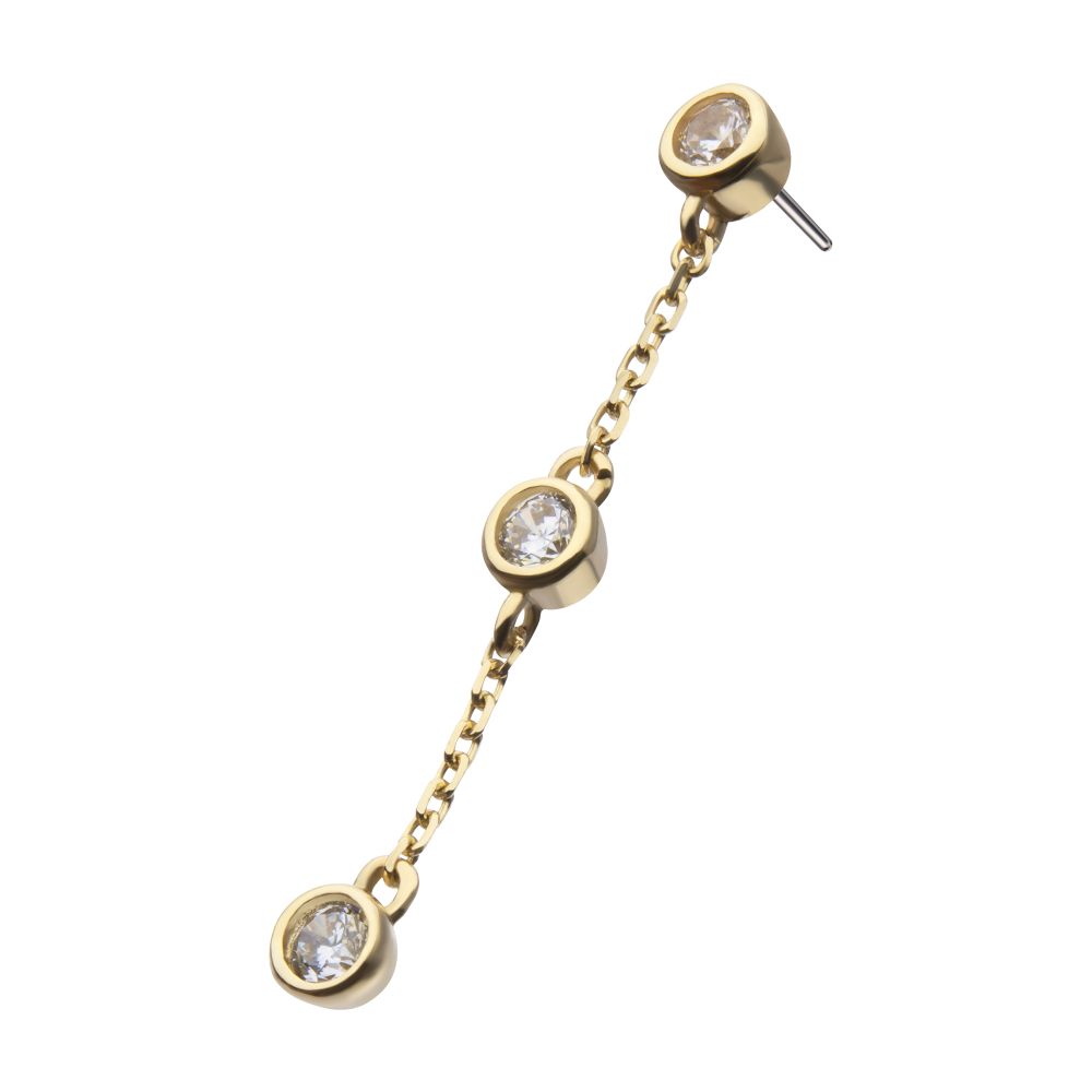 14Kt Yellow Gold Threadless Triple Bezel Set Round Gem Dangle Top. Made of solid 14kt nickel-free Gold with durable 316LVM ASTM F-138 Implant Grade Steel Pin designed to be practical and easy to use. Fits all sizes of pins and bases in our threadless body jewelry line. Pin Size: 0.45mm x 4.7mm.