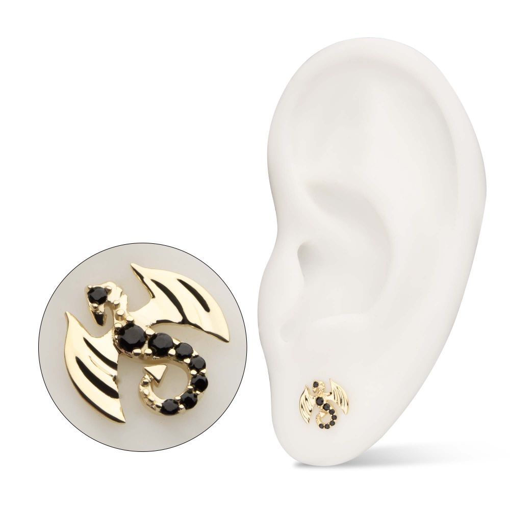14Kt Yellow Gold Threadless Winged Dragon with Prong Set Black Gem Top. Made of solid 14kt nickel-free Gold with durable 316LVM ASTM F-138 Implant Grade Steel Pin designed to be practical and easy to use. Fits all sizes of pins and bases in our threadless body jewelry line. Pin Size: 0.45mm x 4.7mm.
