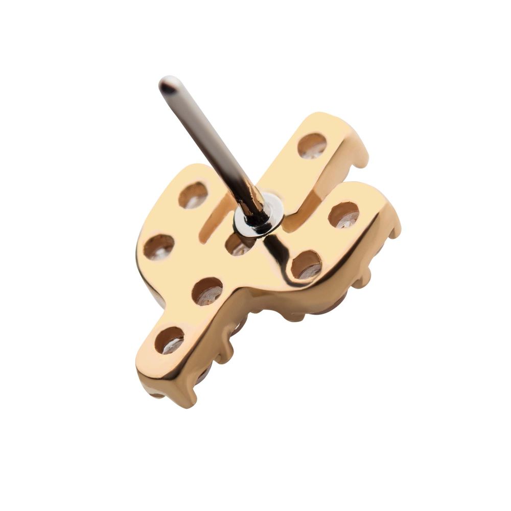 14Kt Yellow Gold Threadless with Prong Set 9 Round Clear CZ Cactus Top is made of solid 14kt nickel-free Gold with durable 316LVM ASTM F-138 Implant Grade Steel Pin designed to be practical and easy to use. Fits all sizes of pins and bases in our threadless body jewelry line. Pin Size: 0.45mm x 4.7mm.