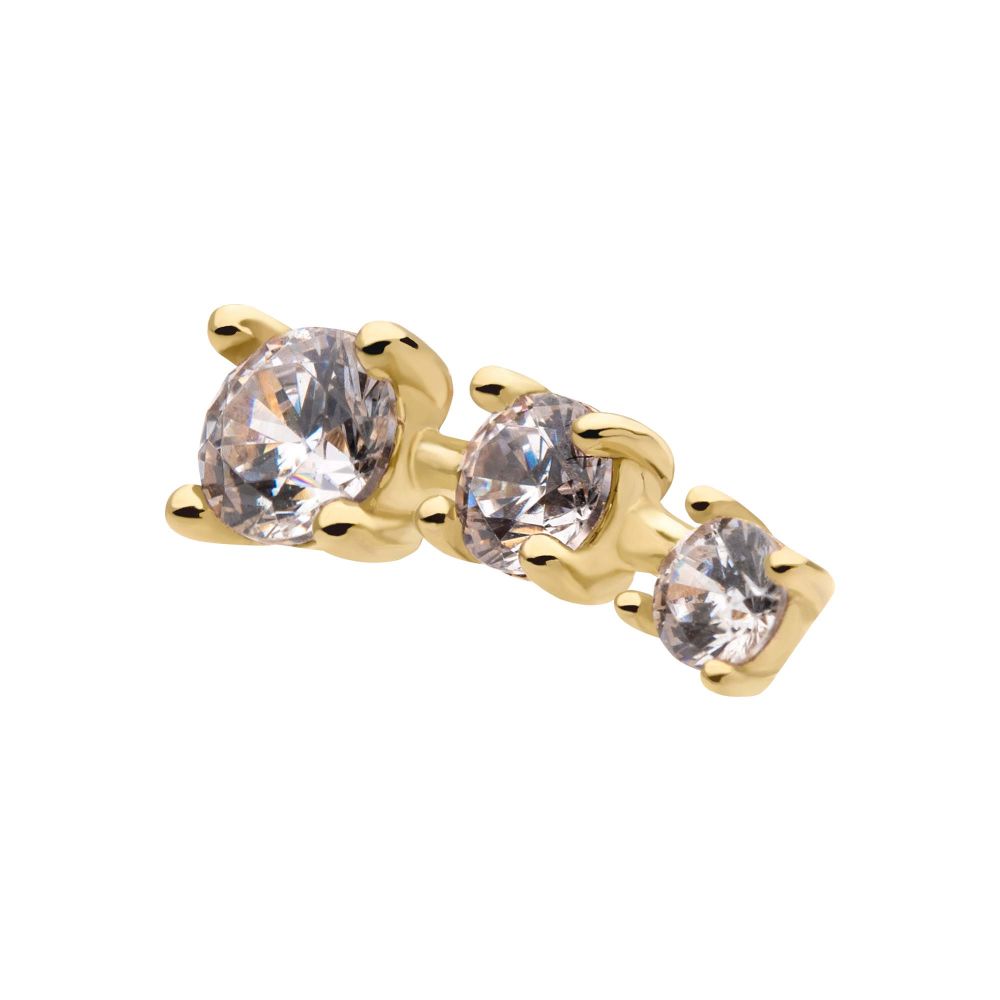 14Kt Yellow Gold Threadless with Prong Set CZ 3-Cluster Top is made of solid 14kt nickel-free Gold with durable 316LVM ASTM F-138 Implant Grade Steel Pin designed to be practical and easy to use. Fits all sizes of pins and bases in our threadless body jewelry line. Pin Size: 0.45mm x 4.7mm.