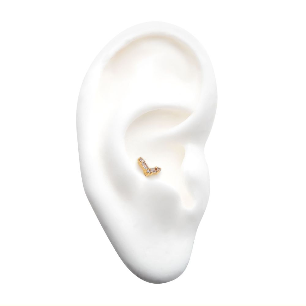 14Kt Yellow Gold Threadless with Prong Set Round and Baguette Clear CZ Triangle Top is made of solid 14kt nickel-free Gold with durable 316LVM ASTM F-138 Implant Grade Steel Pin designed to be practical and easy to use. Fits all sizes of pins and bases in our threadless body jewelry line. Pin Size: 0.45mm x 4.7mm.