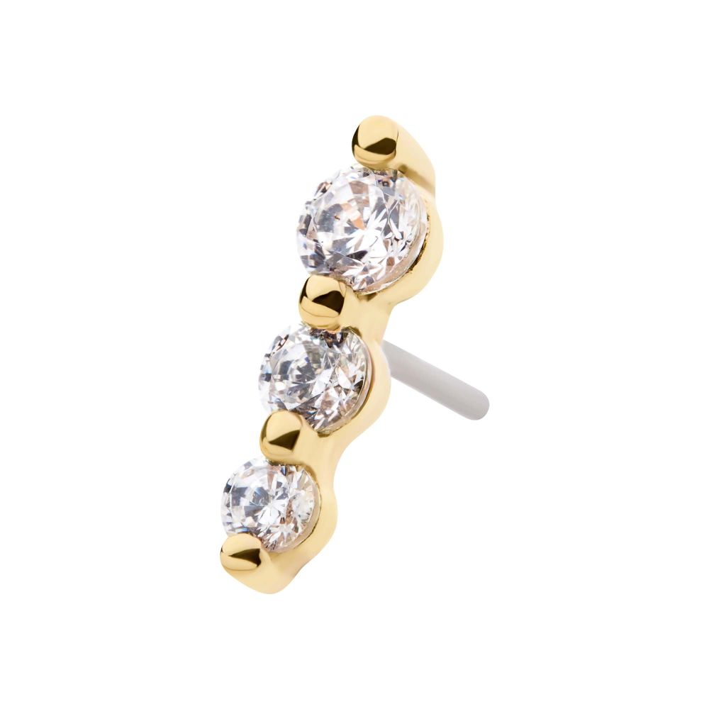 14Kt Yellow Gold Threadless with Prong Set Round CZ 3-Cluster Top is made of solid 14kt nickel-free Gold with durable 316LVM ASTM F-138 Implant Grade Steel Pin designed to be practical and easy to use. Fits all sizes of pins and bases in our threadless body jewelry line. Pin Size: 0.45mm x 4.7mm.
