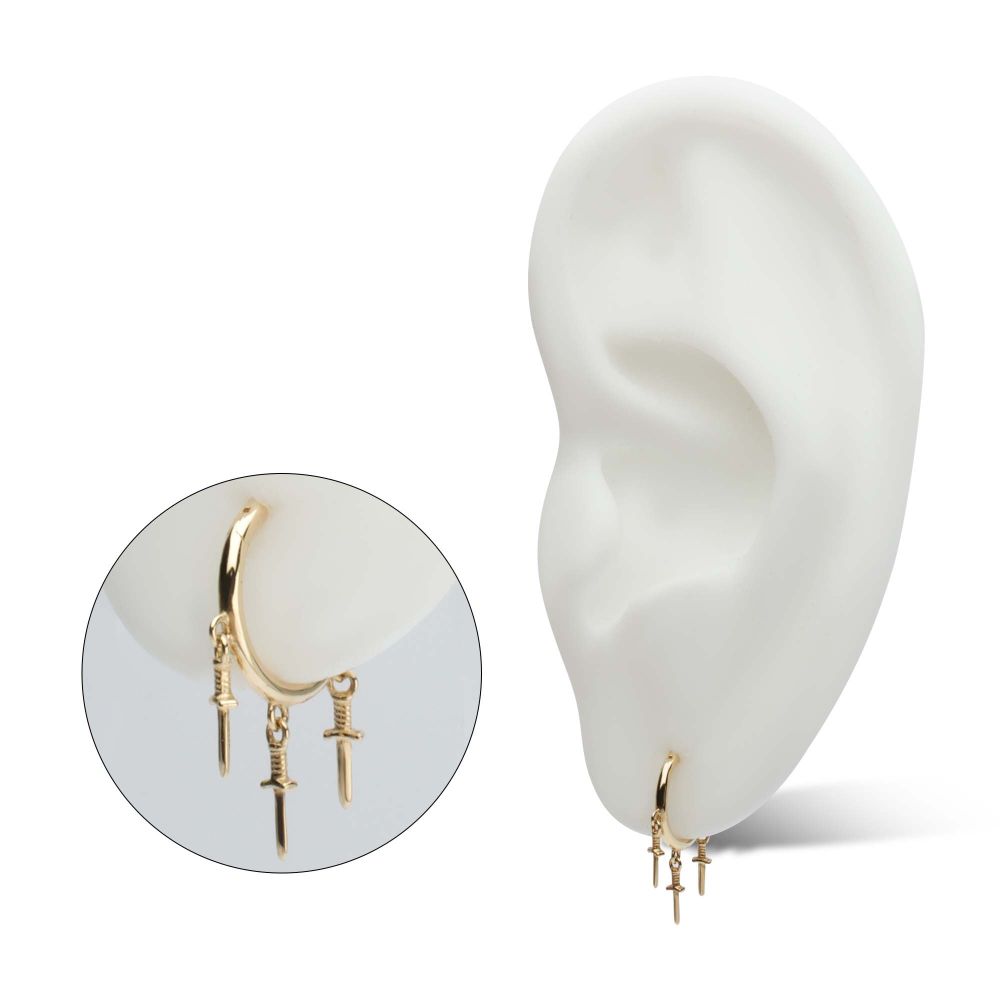14Kt Yellow Gold Triple Dagger Dangle Charm Hinged Segment Clicker. The Hinged Segment Clicker offers an easy-to-use design with a minimal seam for an aesthetic that's similar to a segment ring without the stress of dealing with a segment that can get lost. The Hinged Segment Clicker is characterized by the hinged prong that snaps into place with a satisfying click. Perfect for Helix, Septum, and Cartilage. Made of solid 14kt nickel-free Gold.