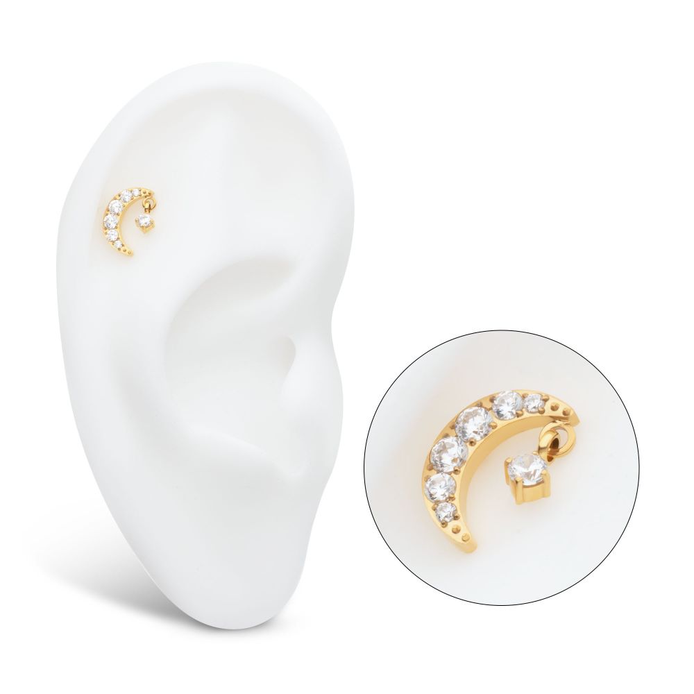 24Kt Gold PVD Titanium Threadless Crescent Moon CZ Top with Dangle Pronged Round CZ. This Threadless Top is made from Implant Grade Titanium TI-6AL-4V ELI ASTM F136 with 25g durable Titanium Pin designed to be practical and easy to use. Fitting all sizes of pins and bases in our threadless body jewelry line. Pin Size: 0.45mm x 4.7mm.