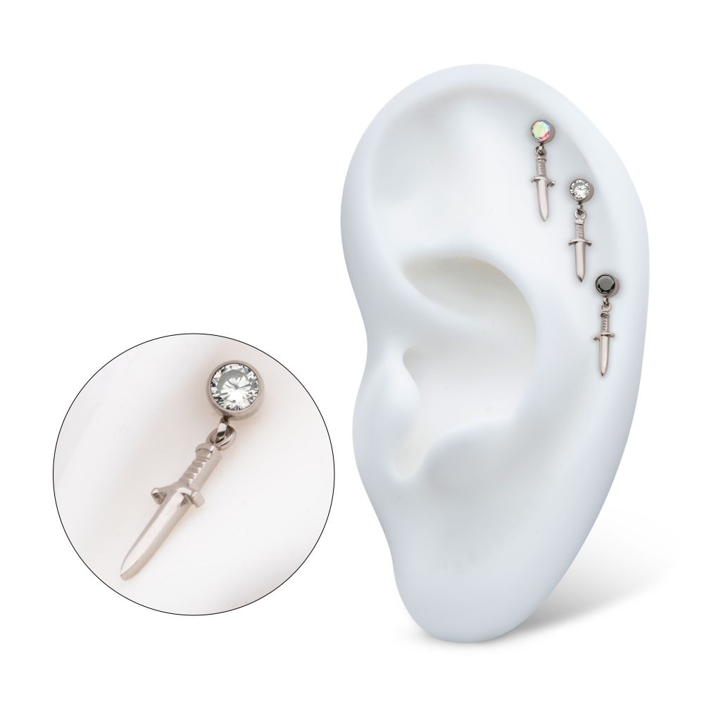 Titanium Internally Threaded Bezel Round CZ Dangle Dagger Top. Manufactured from High Polish Implant Grade Titanium (Ti-6AL-4V-ELI ASTM F136).