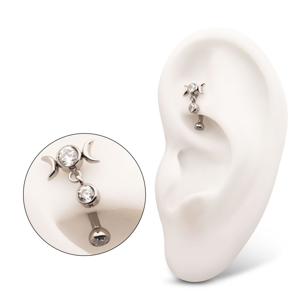 Titanium Internally Threaded Gem Triple Moon Phase Fixed Top Curved Barbell with Floating Bezel CZ Dangle