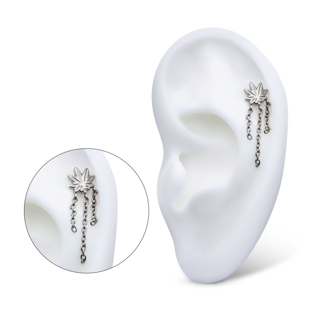 Titanium Internally Threaded Pot Leaf Top with 3 Dangle Chains. Manufactured from High Polish Implant Grade Titanium (Ti-6AL-4V-ELI ASTM F136).