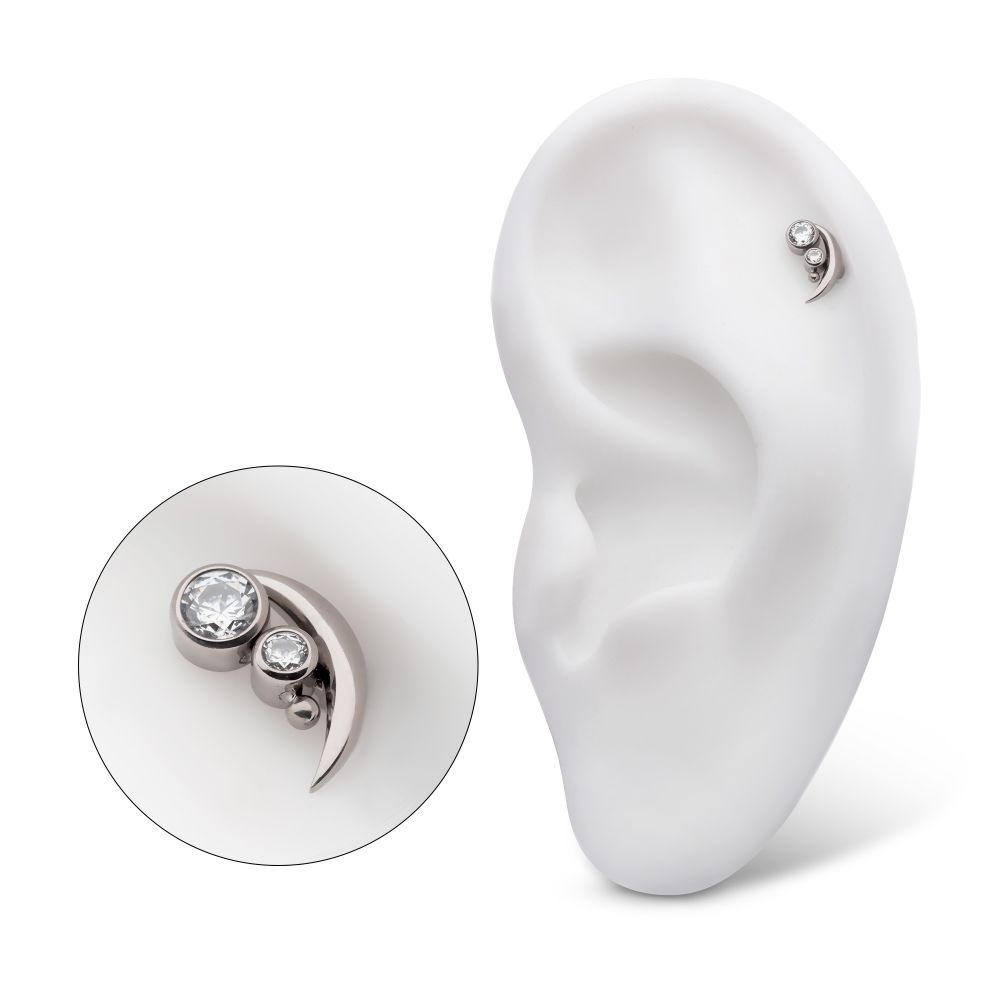 Titanium Internally Threaded with Bezel Set CZ & Bead Crescent Moon Top