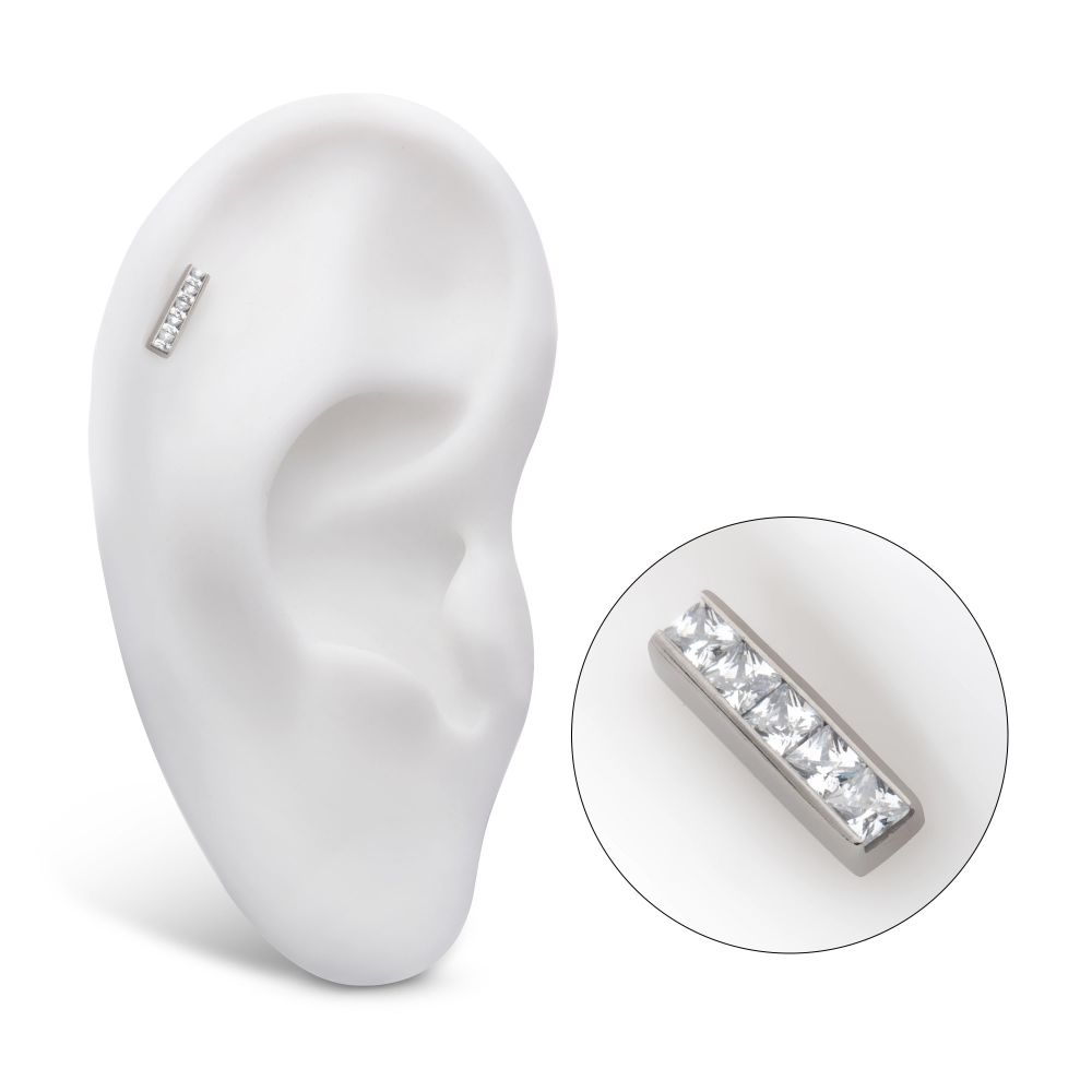 Titanium Internally Threaded with CNC Set Clear CZ 5-Cluster Bar Top. Manufactured from High Polish Implant Grade Titanium (Ti-6AL-4V-ELI ASTM F136).