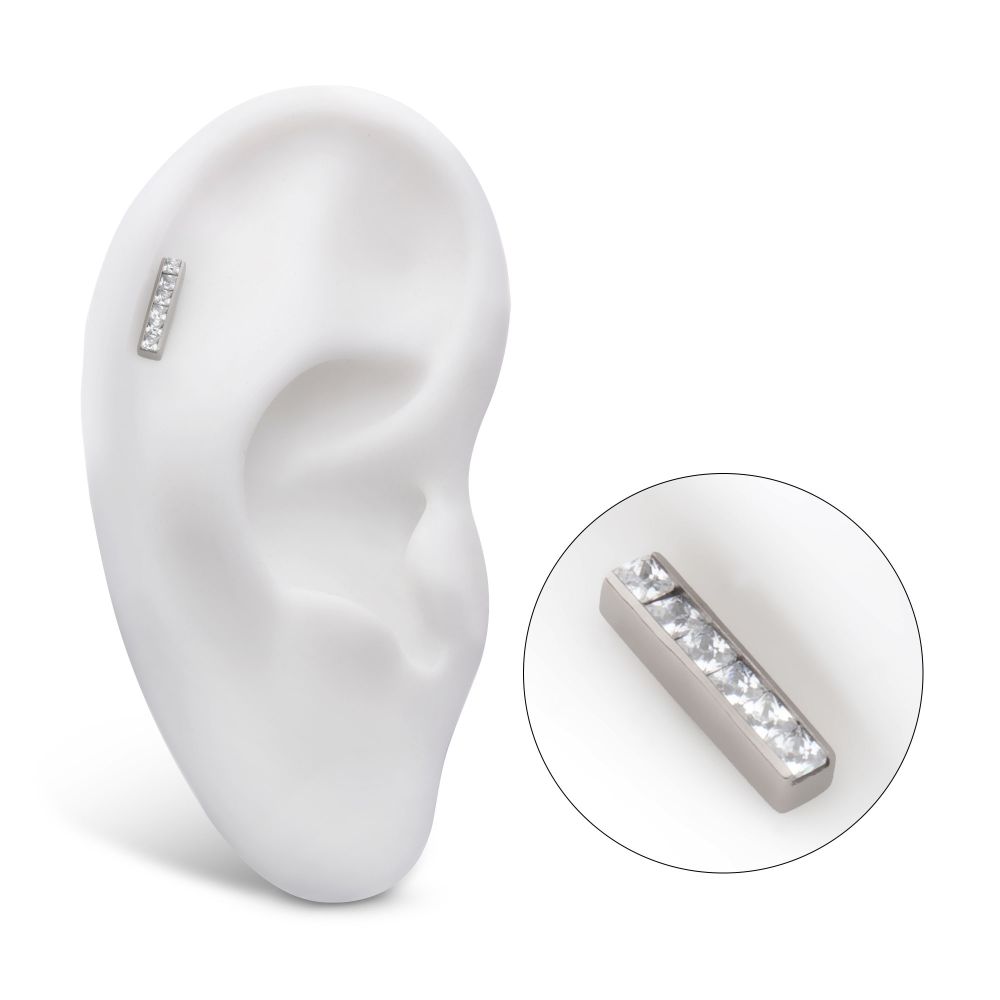 Titanium Internally Threaded with CNC Set Clear CZ 6-Cluster Bar Top. Manufactured from High Polish Implant Grade Titanium (Ti-6AL-4V-ELI ASTM F136).