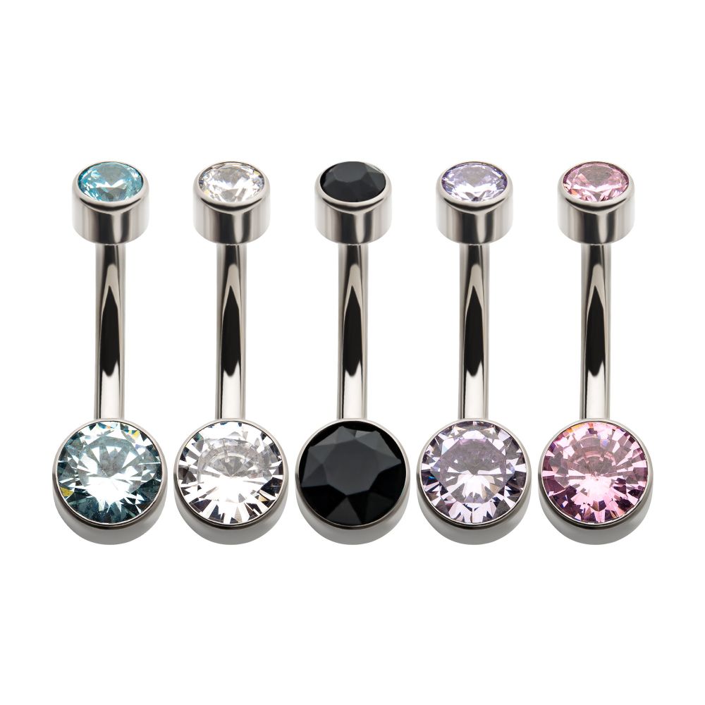 Titanium Internally Threaded with Flat Back Round Bezel Set Double CZ Navel Curves fits M1.2/14g threading. Manufactured from High Polish Implant Grade Titanium (Ti-6AL-4V-ELI ASTM F136).