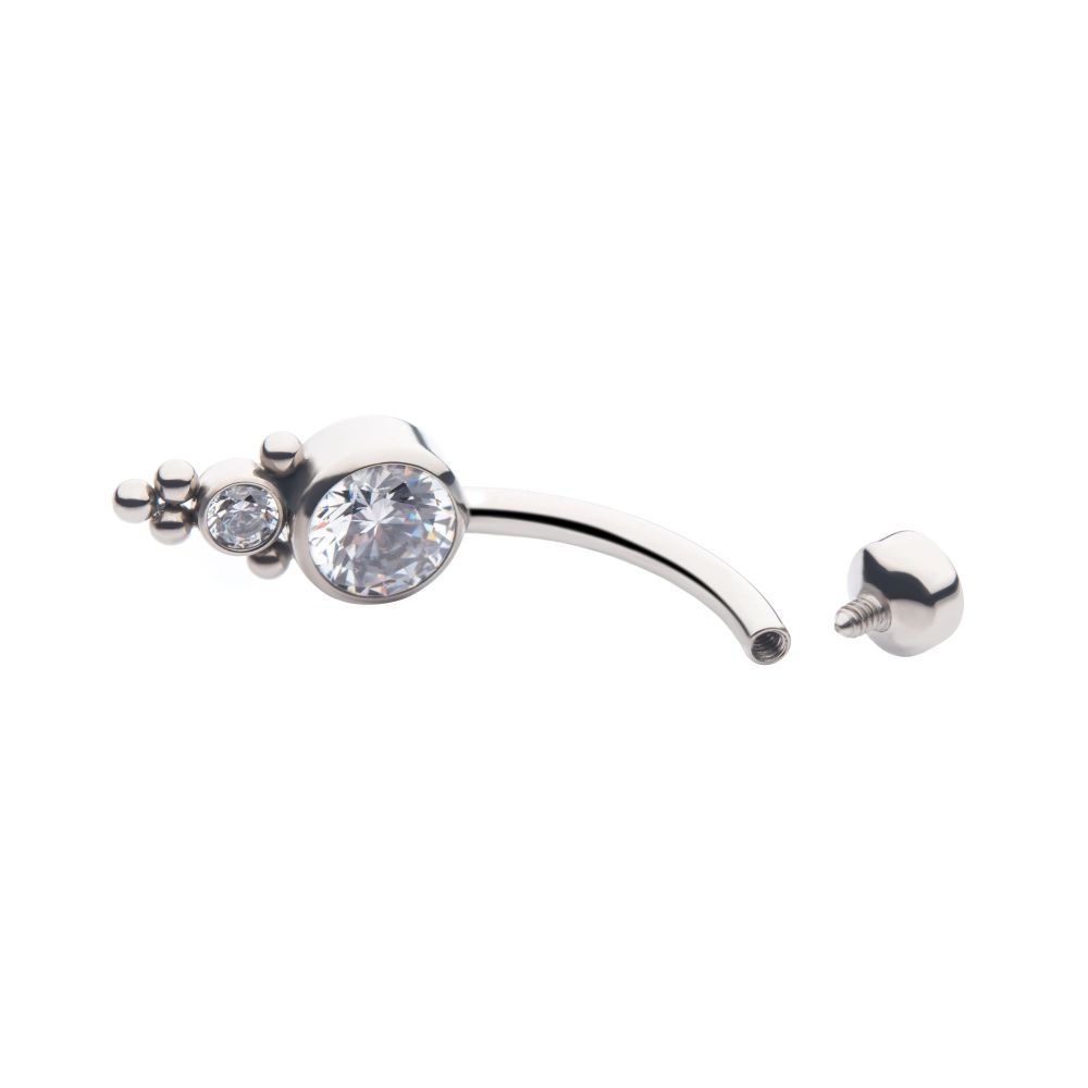 Titanium Internally Threaded with Tri Bead Bezel Set CZ Cluster Navel Curve. M1.2/14G threading. Manufactured from High Polish Implant Grade Titanium (Ti-6AL-4V-ELI ASTM F136).