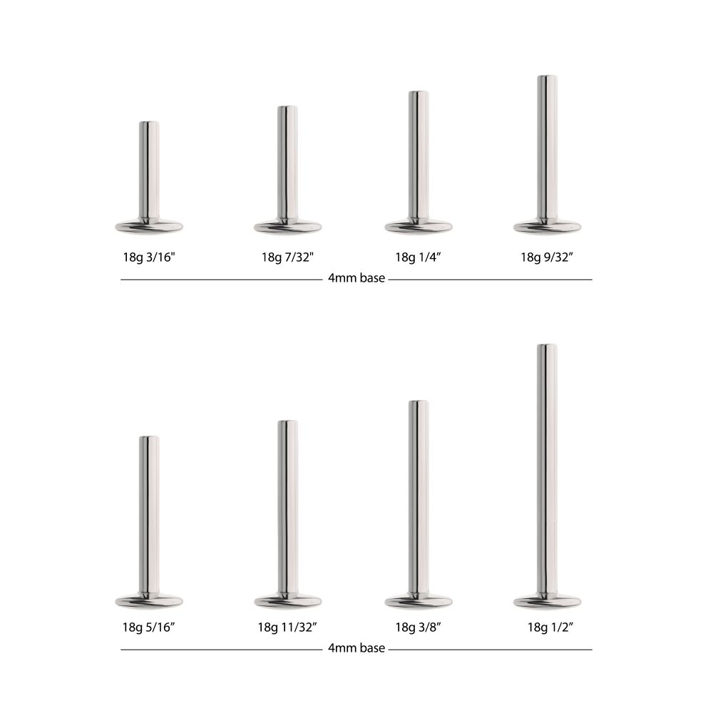 Titanium Threadless High Polish Mirror Finish 4mm Dome Labret Base is manufactured from High Polish Implant Grade Titanium (Ti-6AL-4V-ELI ASTM F136). Any threadless top in the line can be used in any of the Invictus threadless labrets. Pin Gauge: 25g.