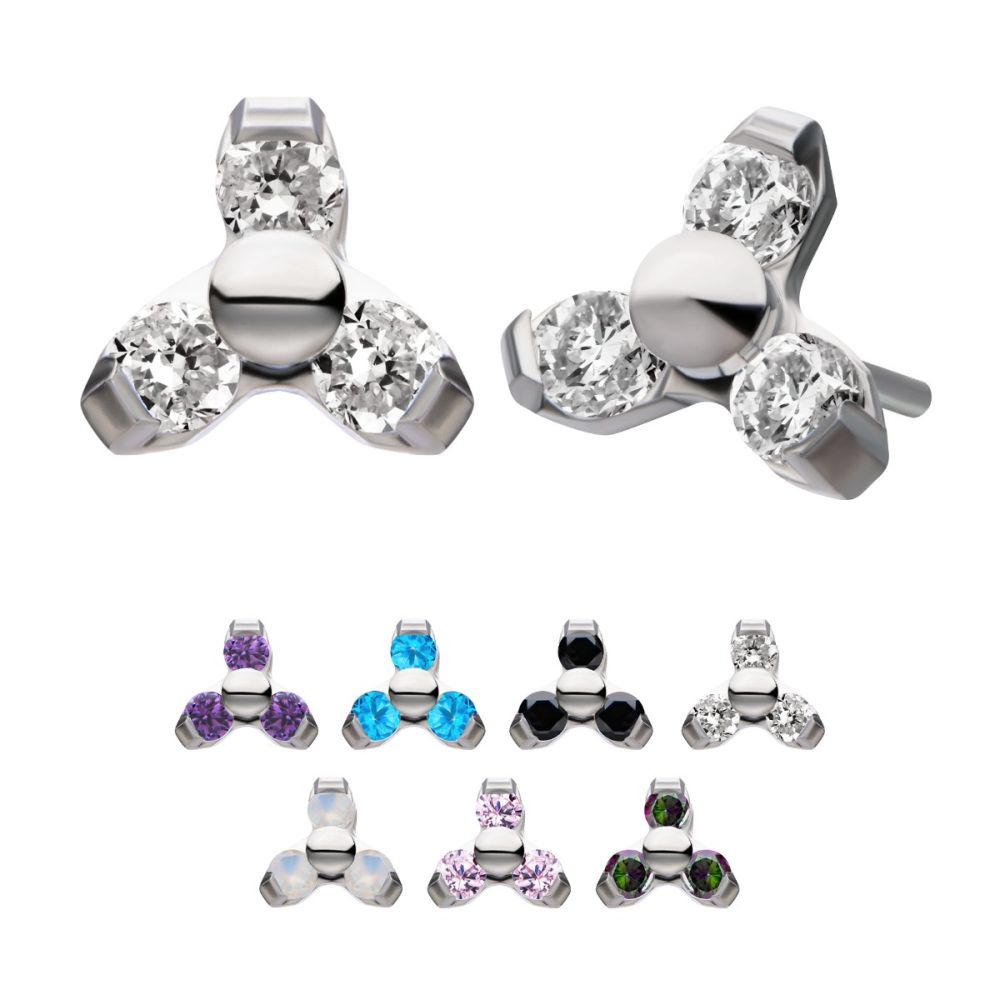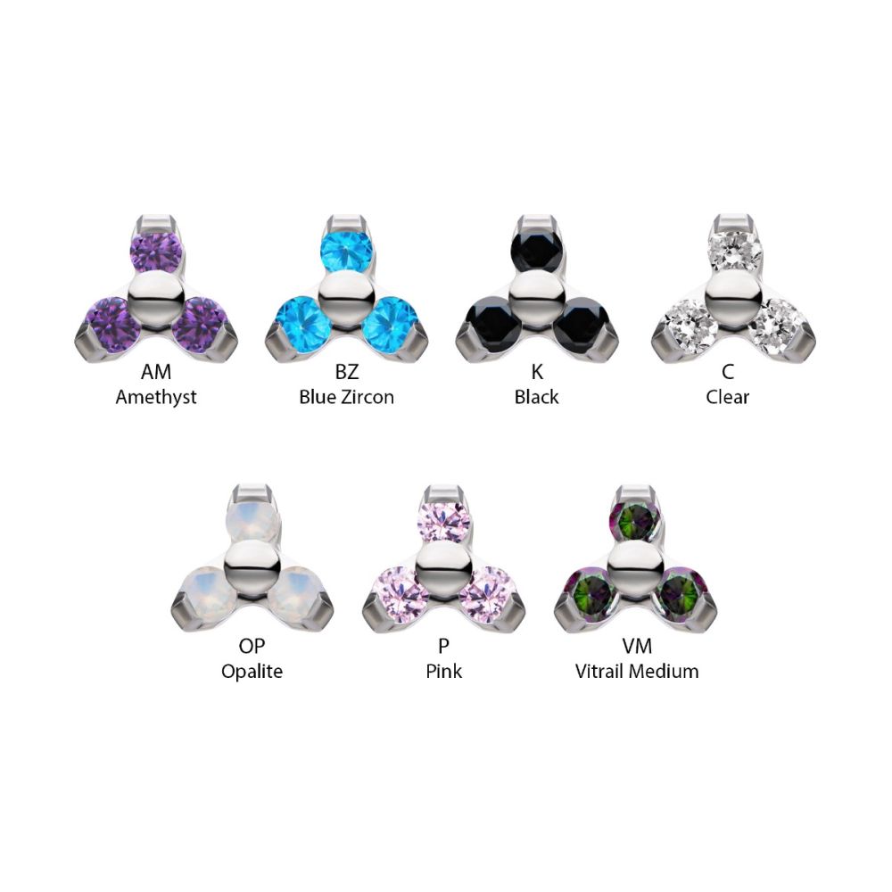 Choose from a variety of colors for this unique three-stone colored cubic zirconia threadless top. Made from titanium, it is an ideal piece for fresh piercings as well as jewelry upgrades. Compatible with any Invictus bar or base in any gauge. To secure inside bar or base, add a slight bend to the pin by simply inserting the pin halfway and pushing the top to one side.