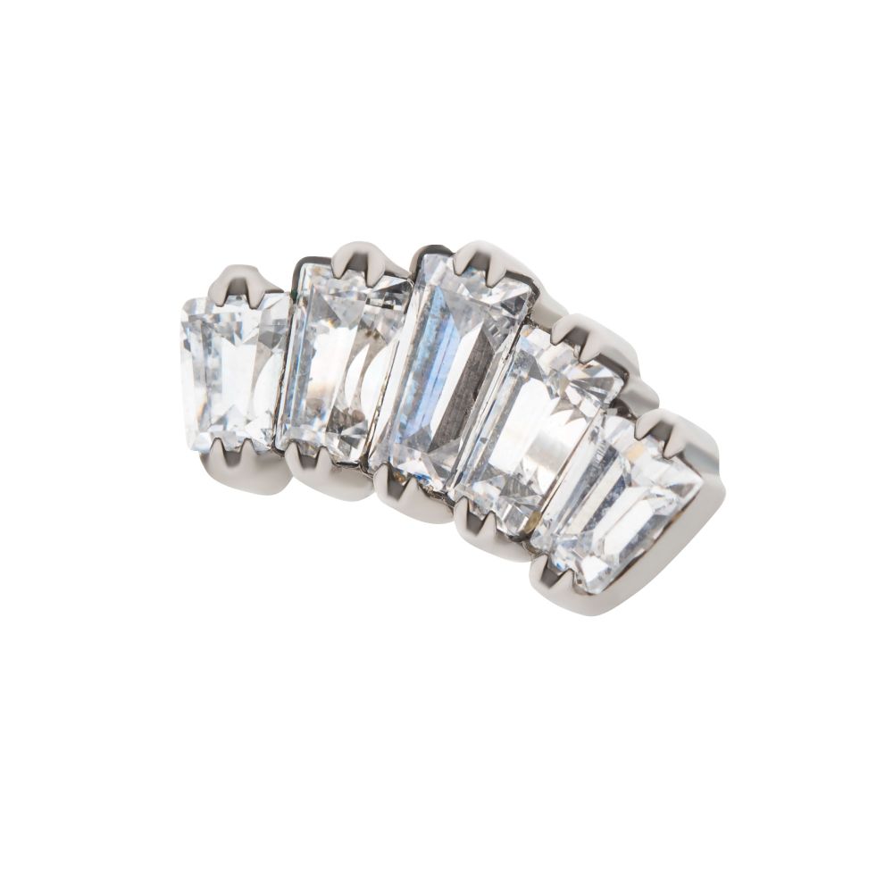 This unique trapezoid threadless titanium five-cluster cubic zirconia top will really stand out in just about any piercing. The versatile piece is made from implant-grade titanium (Ti-6AL-4V-ELI ASTM F136) and is compatible with any of our threadless bases. Pin Gauge: 24g x 4.5mm (L). Pin Size: 0.45mm x 4.7mm.